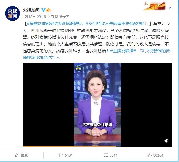【#海霞谈成都确诊病例遭网暴#:#我们的敌人是病毒不是感染者#!】海霞:今天,四川成都一确诊病例的行程轨迹引发热议,其个人隐私也被泄露,遭网友谩骂。她对疫情传播该负什么责,还需调查认定;即使真有责任,这也不是曝光其信息的理由。她的个人生活不该是公共话题,防疫才是。我们的敌人是病毒,不是感染病毒的人。战疫要讲科学,也要讲法治!