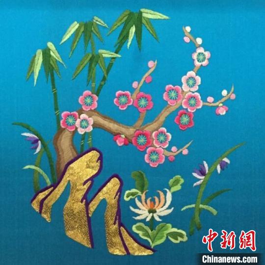 “在《花中四君子》绣品中的假山,我运用了平金夹绣,梅花花瓣和菊花叶用了分层破色、花蕊用了散光针和打籽针,兰草和菊花用了滚针,竹叶则用了斜平针。”周卓灵表示,这一针一线不仅展现了汉绣艺术之美,更是锻炼了自己的细心和耐心。