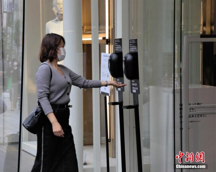 资料图为日本东京一市民进入商场前进行手指消毒。 中新社记者 吕少威 摄