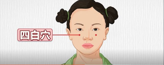 四白穴是眼睛下方的一个穴位,四白穴按揉能够缓解用眼过度带来的眼肌疲劳。食指轻轻放到鼻翼两旁适度按揉,大拇指放在下颌凹陷处,做四个八拍。