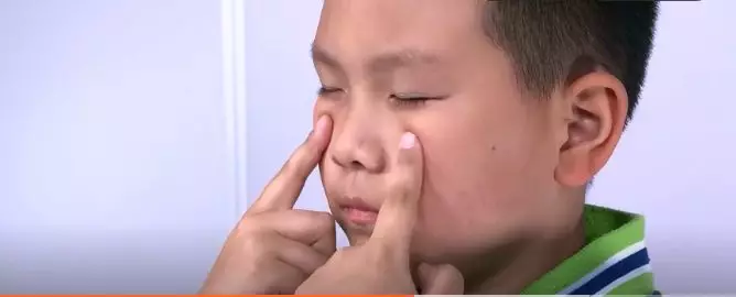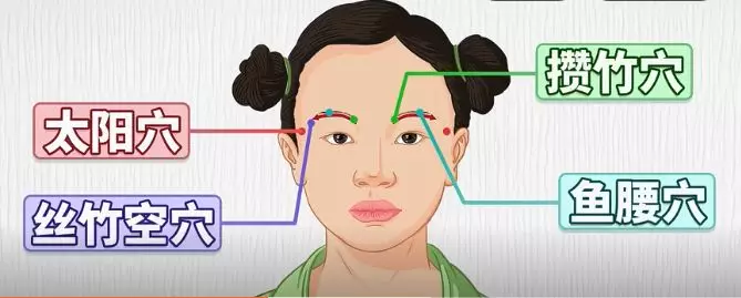 首先用大拇指放在两侧的太阳穴上,太阳穴是由眉梢和眼角向后延伸的凹陷处,做轻度的按压,有些酸胀感为宜。做完太阳穴揉按之后刮上眼眶。按揉太阳穴做四次,刮上眼眶做两次,如此交替做四个八拍。