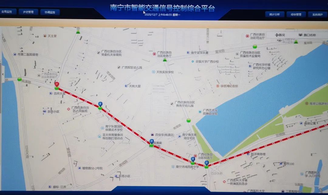 同时首次通过“南宁市智能交通信号控制综合平台”进行远程信号控制,即时设计生成“绿波带”线路预案,让刘先生的车一路绿灯,快速通行。