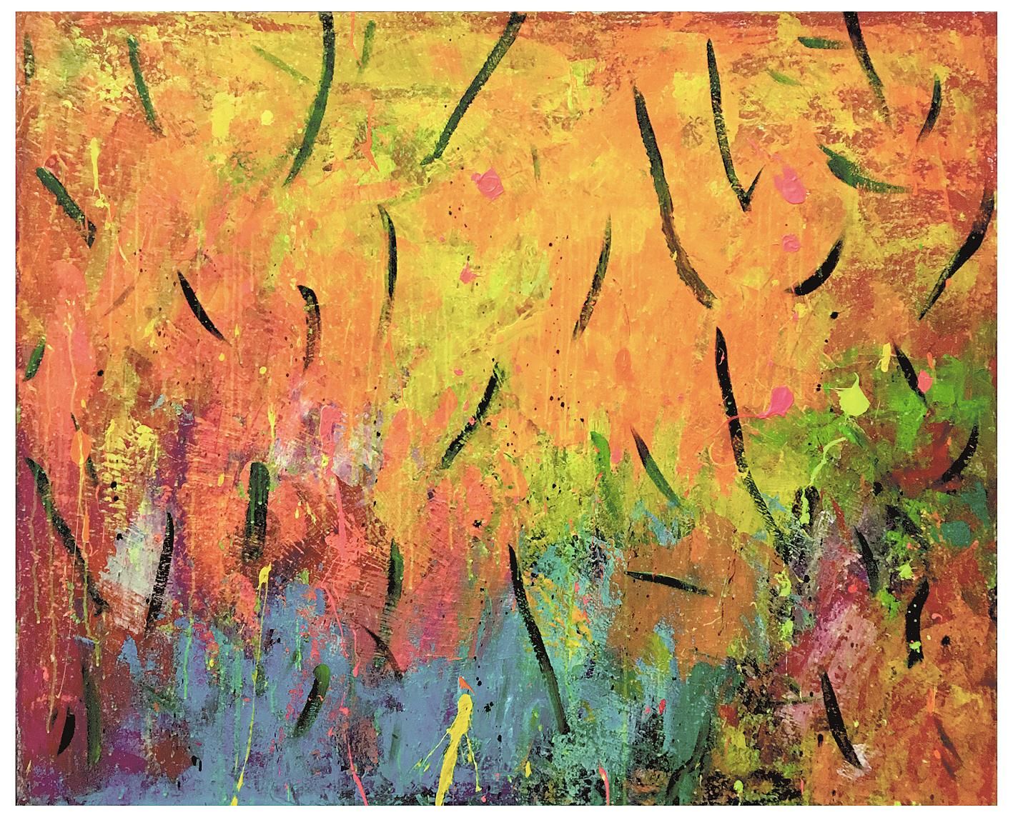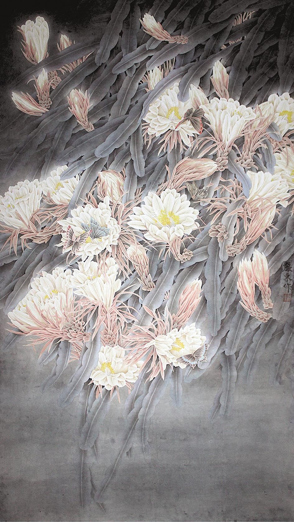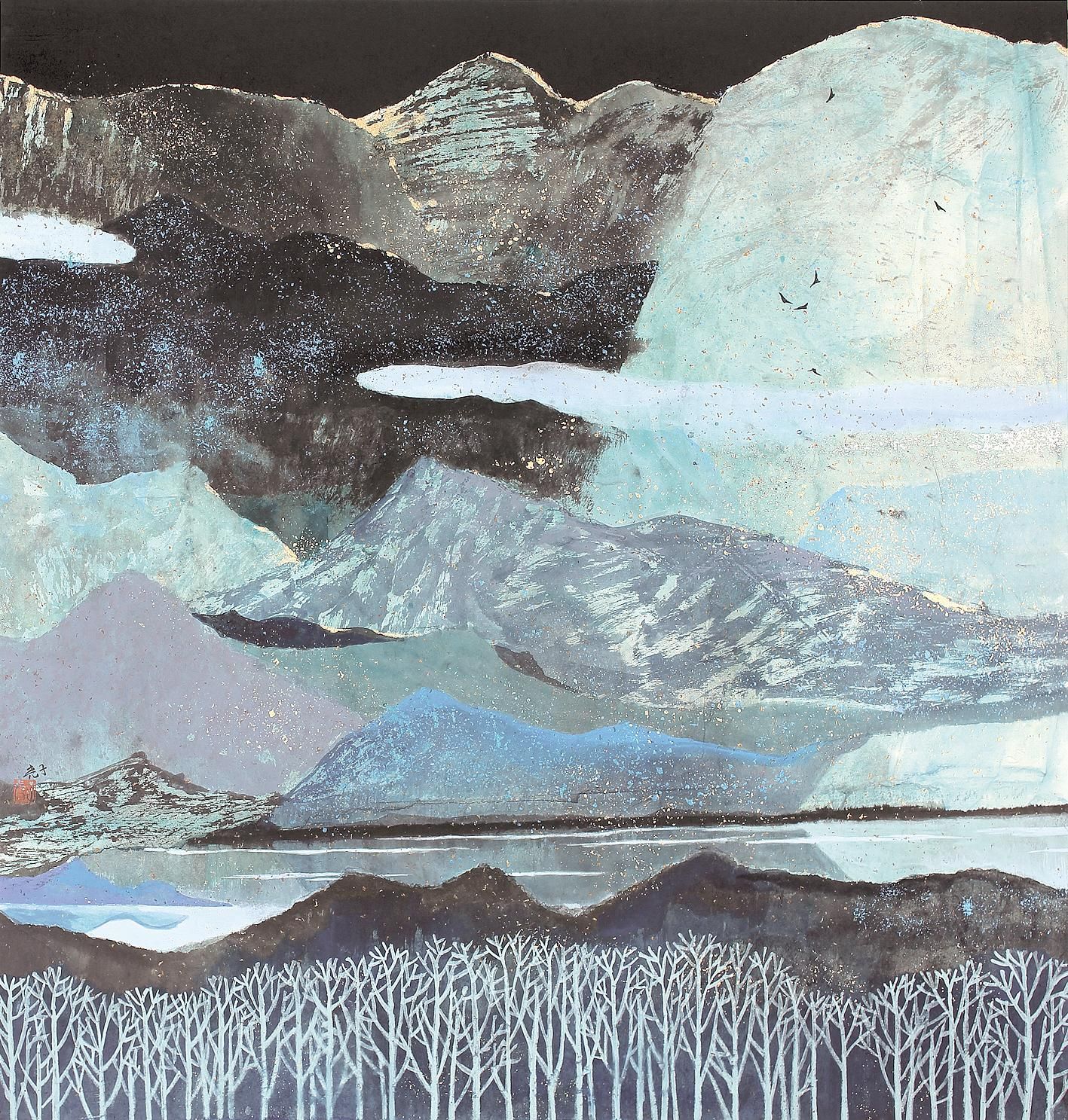 金色月光的映照下,浅白色青色的灌木树林托起整个画面,由近至远、层层递进。青年画家沈子尧的作品 《夜——金辉》 色调偏冷,表现夜晚的丝丝凉意,而这色调寂静又不沉闷,几只飞鸟恰有“鸟鸣山更幽”的诗意,给画面一些生动的元素,夜晚月光反射下的金色光芒,又留给读者一点温存。毕业于中央美术学院的沈子尧作品并非传统意义上的山水画作品,而是在传统山水画元素中加入了西方绘画技法、实验水墨及综合材料技法等等,并且在构图上融进了西方构成观念,在形式感上求突破,观念上也更加新颖。