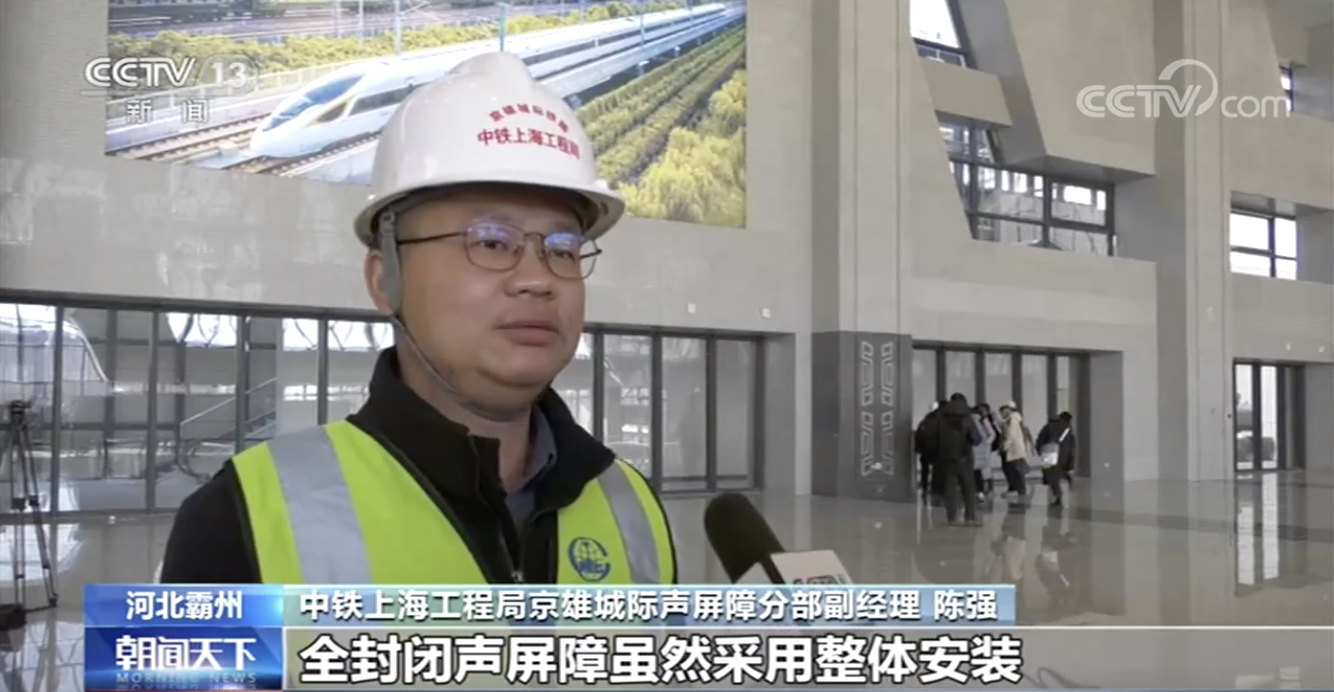 中铁上海工程局京雄城际声屏障分部副经理 陈强:“全封闭声屏障虽然采用整体安装,但整个声屏障上还有一万多个螺栓,列车350公里时速穿行尤其在两车交会时冲击力相当大,为了确保螺栓不脱落我们在螺栓尾部加上了双重保险,确保了行车的安全。”