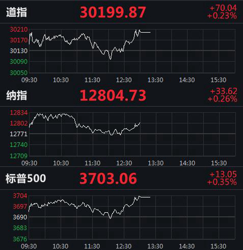 截至美股收盘,道指涨70.04点,涨幅0.23%,报30199.87点;纳斯达克指数涨33.62点,涨幅0.26%,报12804.73点;标普500指数涨13.05点,涨幅0.35%,报3703.06点。