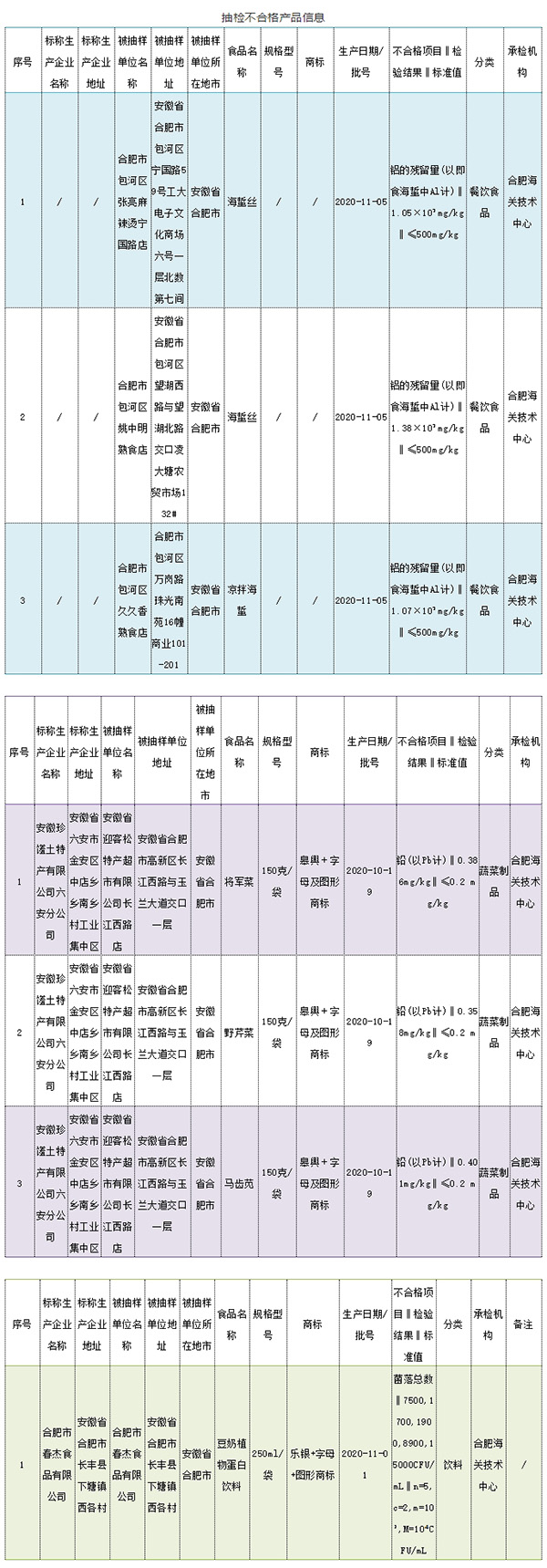 合肥市包河区张亮麻辣烫宁国路店销售的海蜇丝、合肥市包河区姚中明熟食店销售的海蜇丝、合肥市包河区久久香熟食店销售的凉拌海蜇,铝不符合食品安全国家标准规定。检验机构为合肥海关技术中心。