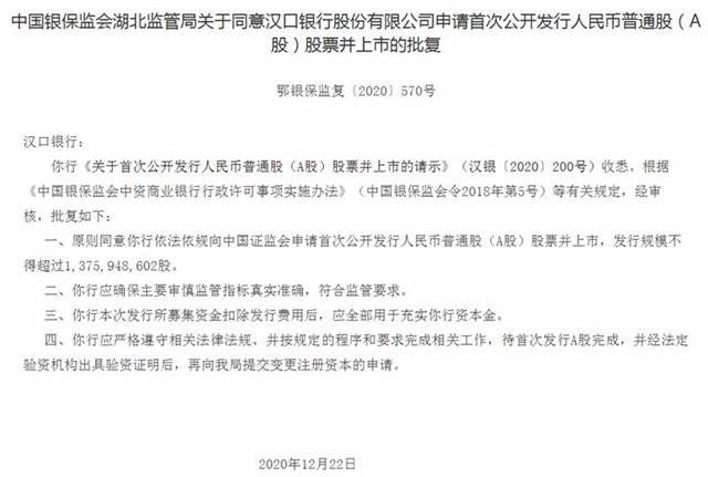 12月25日,湖北银保监局发布公告称,同意汉口银行申请首次公开发行人民币普通股(A股)股票并上市,发行规模不得超过13.76亿股。与此同时,湖北银保监局也强调,汉口银行应确保主要审慎监管指标真实准确,符合监管要求;本次发行所募集资金扣除发行费用后,应全部用于充实汉口银行资本金;待首次发行A股完成,并经法定验资机构出具验资证明后,再向该局提交变更注册资本的申请。