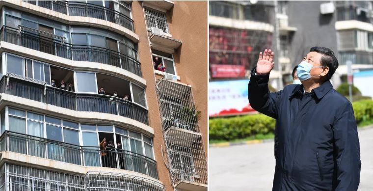 ↑3月10日,中共中央总书记、国家主席、中央军委主席习近平专门赴湖北省武汉市考察新冠肺炎疫情防控工作。这是习近平在东湖新城社区考察时,向在家隔离居住的居民挥手致意、表示慰问(拼版照片)。新华社记者 谢环驰 摄