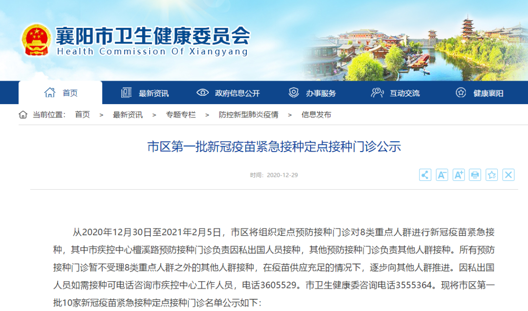 襄阳市区第一批10家新冠疫苗紧急接种定点接种门诊名单公示如下: