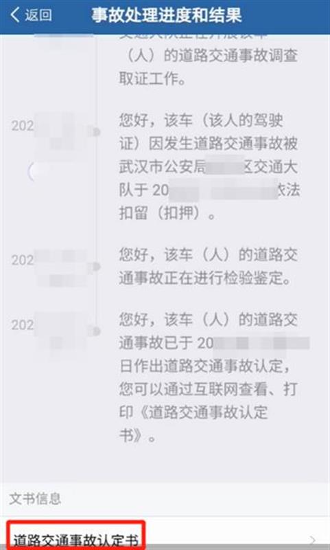 记者从武汉交管部门获悉,为进一步深化公安交管“放管服”改革,提高事故处理工作的公开透明度和群众满意度,根据公安部交管局的统一部署,自2021年1月1日起,道路交通事故处理进度和结果将实现网上查询功能。经确认需按一般程序办理的交通事故,事故当事人在配合公安民警进行事故调查之后,即得到一份《道路交通事故处理进度和结果网上查询凭证》,回到家中后,当事人只需打开“交管12123”手机APP或登录互联网服务平台,输入查询凭证上记录的“事故编号”和“查询码”就可以对这起道路交通事故进行实时的跟踪和关注。