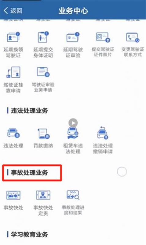 2、向下滑动屏幕找到“事故处理业务”栏,点击“事故处理进度和结果”功能按钮;
