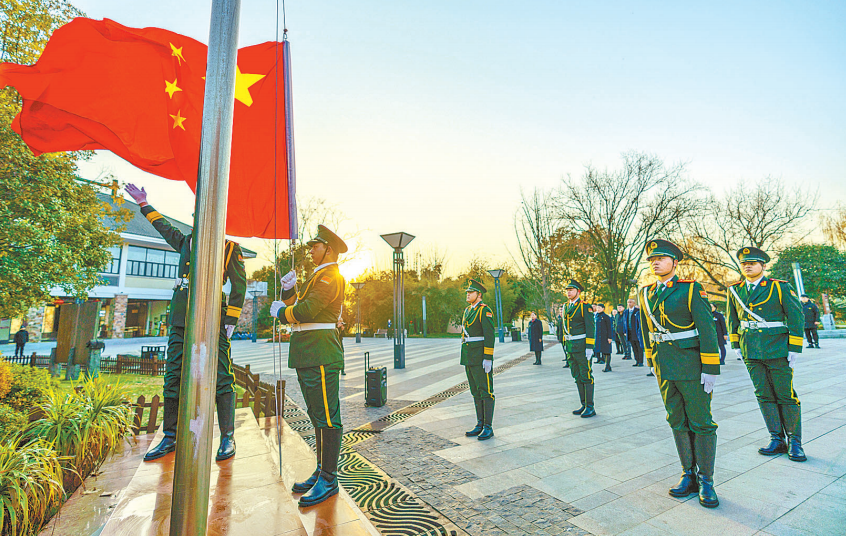 2021年1月1日早上,在东湖绿道湖光序曲广场,伴随着庄严的国歌声,鲜艳的五星红旗在新年第一缕阳光中冉冉升起。
