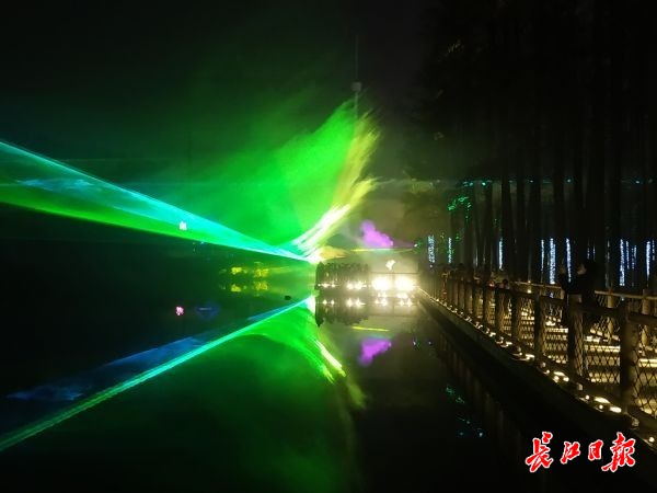 在欢乐谷的“极光森林”,银色灯光布置的水杉林如梦如幻。穿过梦幻水杉林,游客眼前的水上丛林出现一片炫丽的“极光”。空气中水雾弥漫,好似给“极光”蒙上一层面纱,“极光”伴着音乐瞬息变化,游客直呼:太浪漫了。
