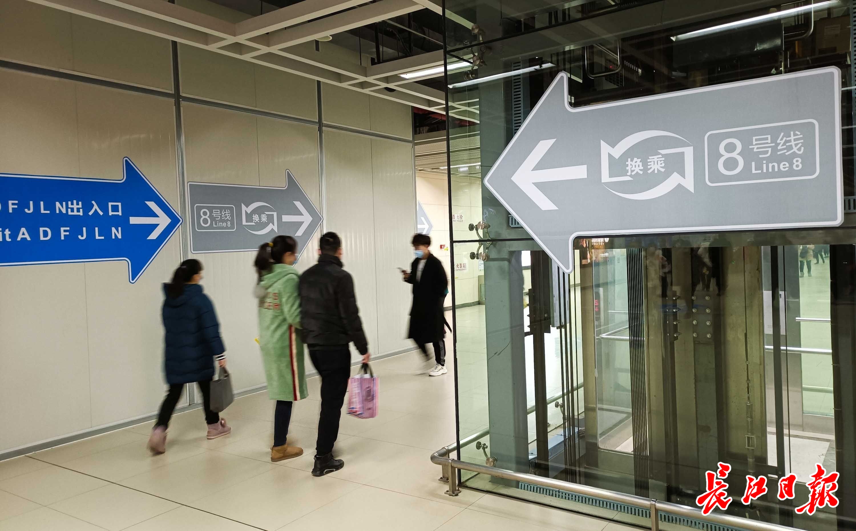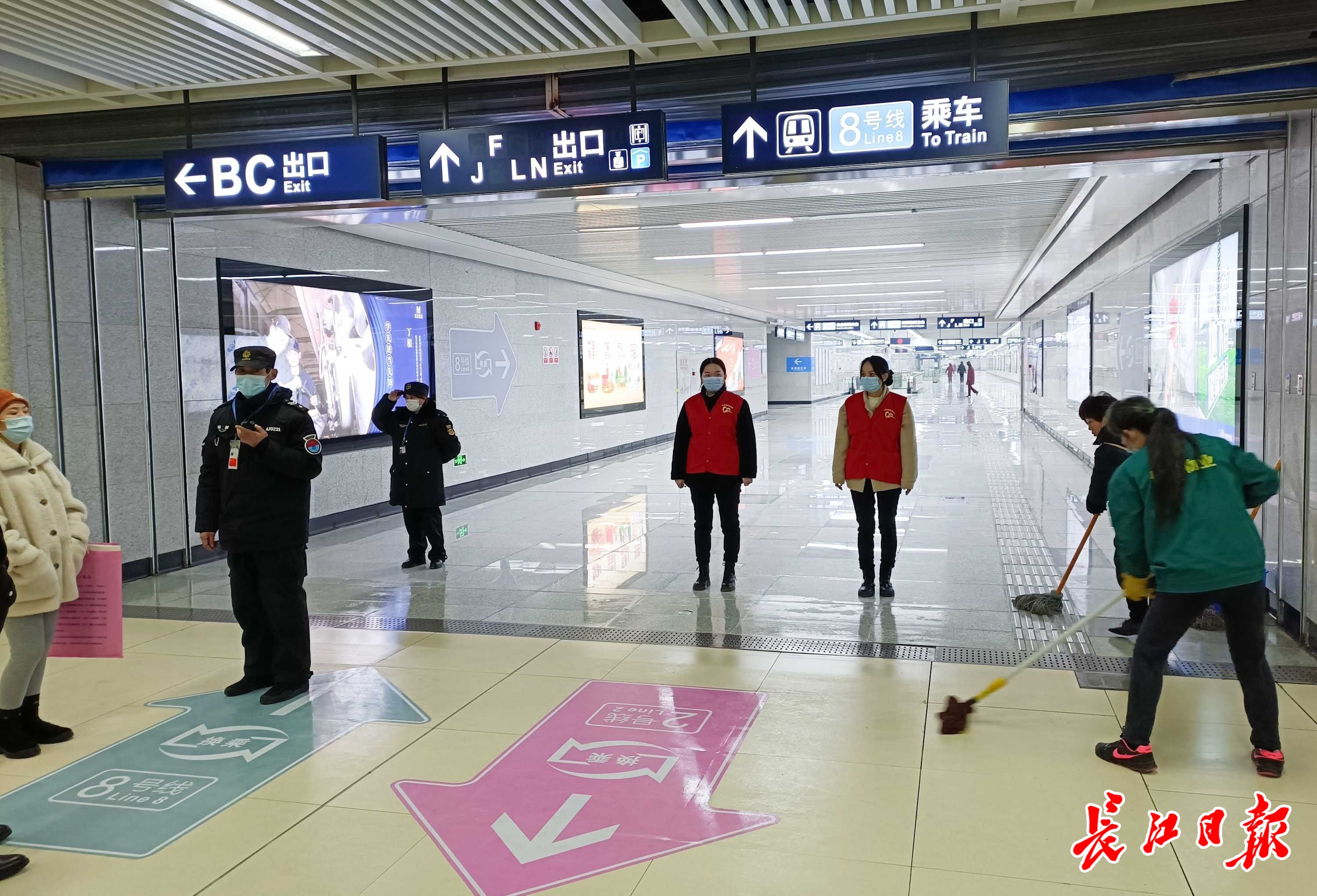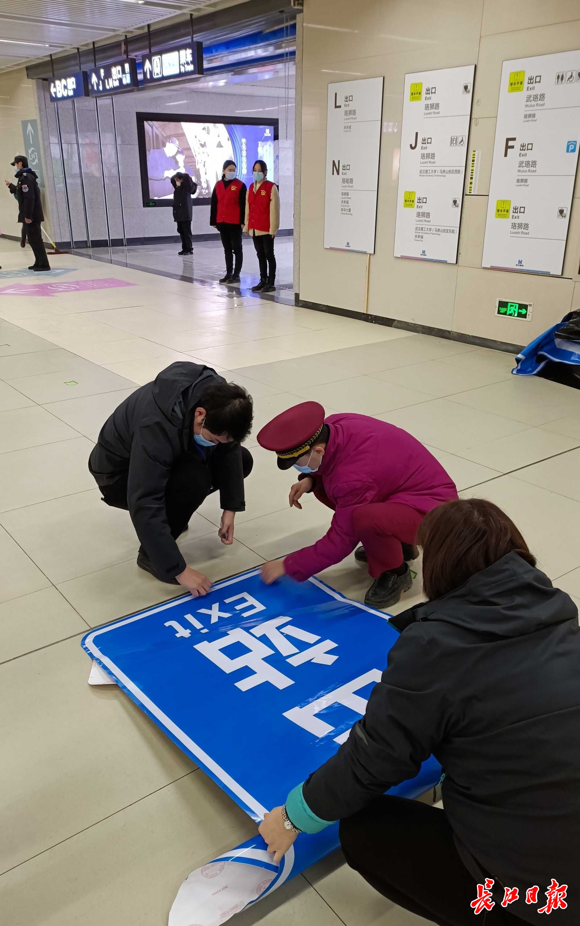 长江网1月2日讯 1月2日上午9时许,街道口地铁站,8号线二期与2号线换乘通道已打开,但禁止乘客进入。工作人员在地面上粘贴指示标志。10时许,地铁工作人员在洪山路站外列队,等候新线路开通。(记者李永刚 摄影报道)