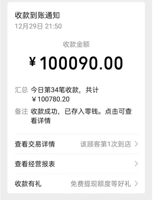 董玲说,这名男性乘客上车后就躺在后座上休息,这一路,两人几乎没说话。车辆到达目的地之后,出租车计价器显示车费为10.9元,该乘客扫了一下董玲的支付码,支付了车费后便下了车。董玲看了一下收款记录,上面的数字让她惊呆,乘客竟然给她支付了十万零九十块。看到这多出来的巨款,董玲赶紧下车,追上了这名乘客。