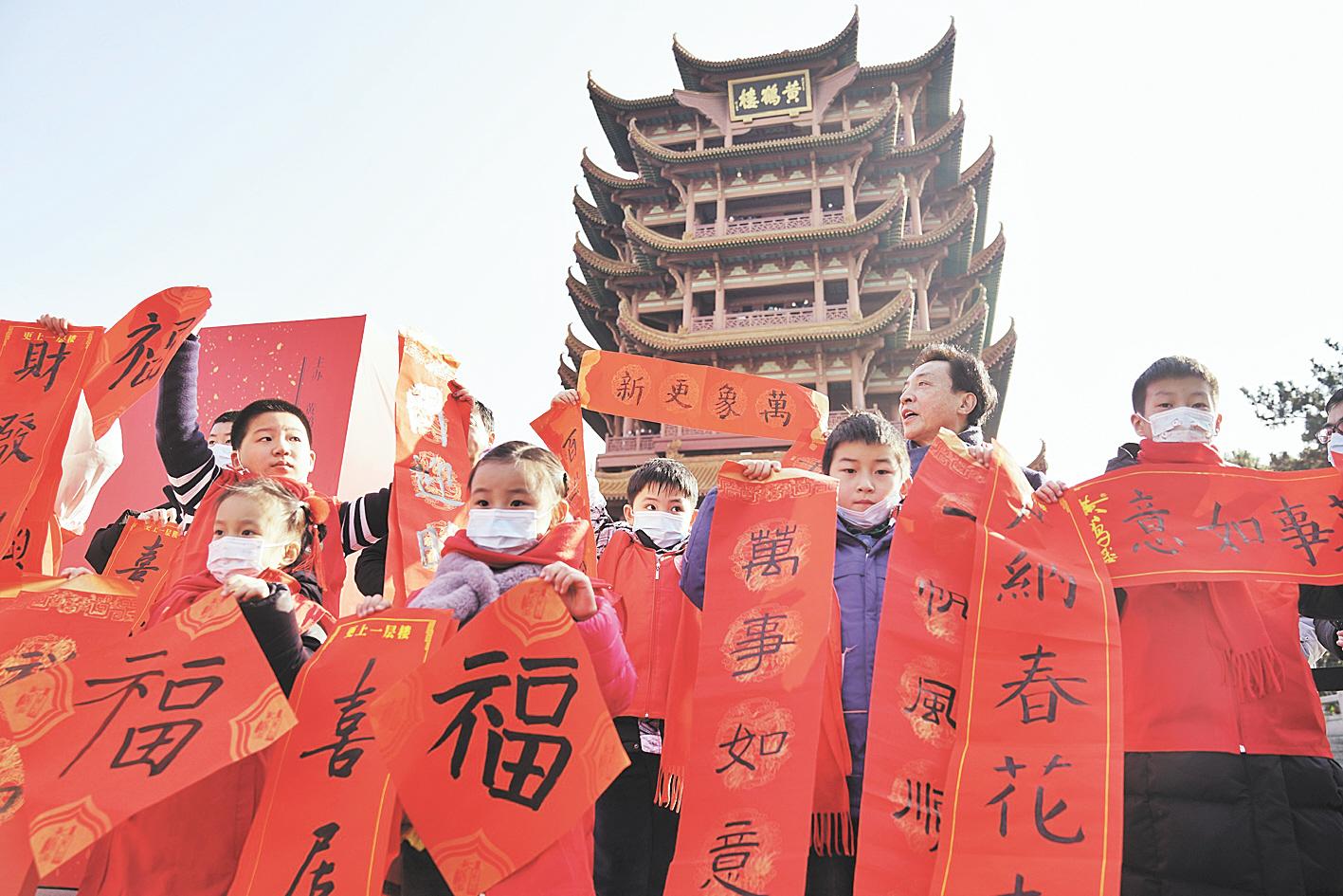1月1日,黄鹤楼下墨香四溢,第四届书法迎新春活动拉开帷幕。此次活动以“书写不平凡,新年‘牛’起来”为主题,来自湖北省少儿书法协会的小书法家们和爱好书法的市民在西区广场组成百人书法方阵,在五位书法家的带领下挥毫泼墨,共同迎接新的一年。据园方介绍,从1月1日到2月7日,黄鹤楼每天都将有书法名家为游客免费书写主题新春楹联。(湖北日报全媒记者 倪娜 通讯员 江萌 摄)