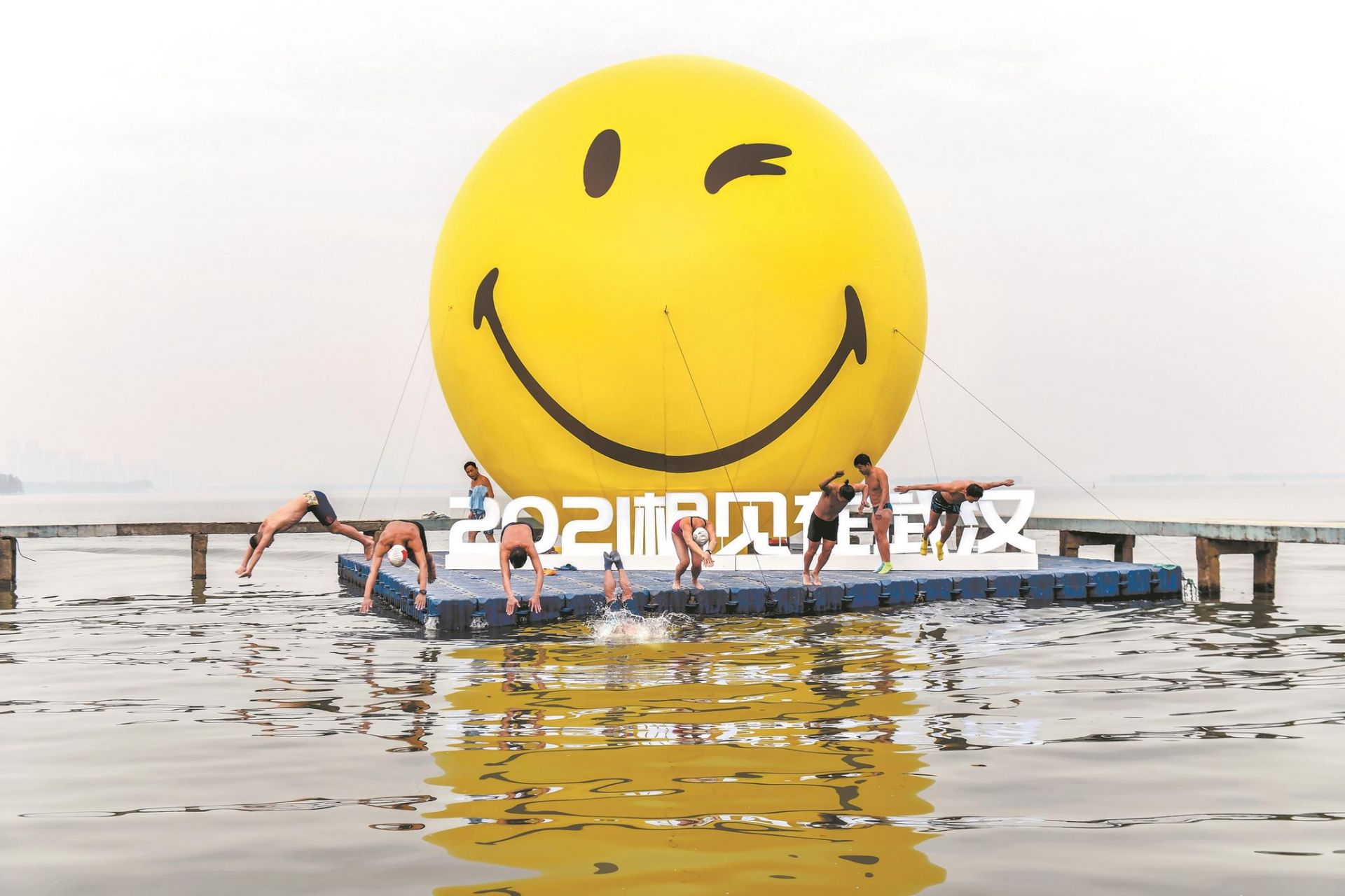 昨日,在武汉东湖凌波门游泳池水面浮台,凌波门跳水队队员以新设置的巨大黄色气球笑脸为背景,进行精彩的跳水表演,引来众多游客观看、喝彩。据了解,该跳水队由各行各业的数十名跳水运动爱好者组成,他们计划在2021年的每一天,都安排队员来此表演跳水,既强身健体,也娱乐游客。楚天都市报记者李辉摄