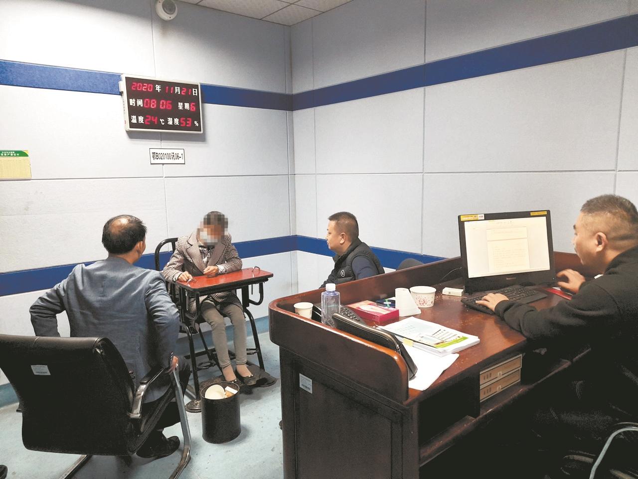 姜某心(左二)接受审讯