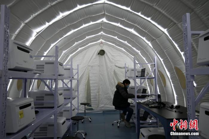 1月8日,石家庄市全员检测核酸第三天。在河北医科大学第一医院检验中心,距离“病毒”最近的医护工作者们正在认真的工作。据该医院检验中心主任张征介绍,为确保核酸检测额准确高效,该中心的医护人员实行24小时轮换上岗,目前日均核酸检测2万至3万人次。7日0—24时,石家庄新增31本地新冠肺炎确诊病例,新增35例无症状感染者。图为忙碌的医护工作者。 中新社记者 翟羽佳 摄