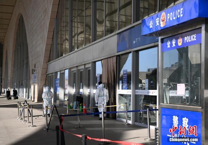 1月9日,河北省石家庄市的石家庄火车站一处进站口有工作人员进行管控。自从1月6日起,石家庄火车站实行临时性严防严控措施,所有乘客一律暂停进站乘车。 中新社记者 侯宇 摄
