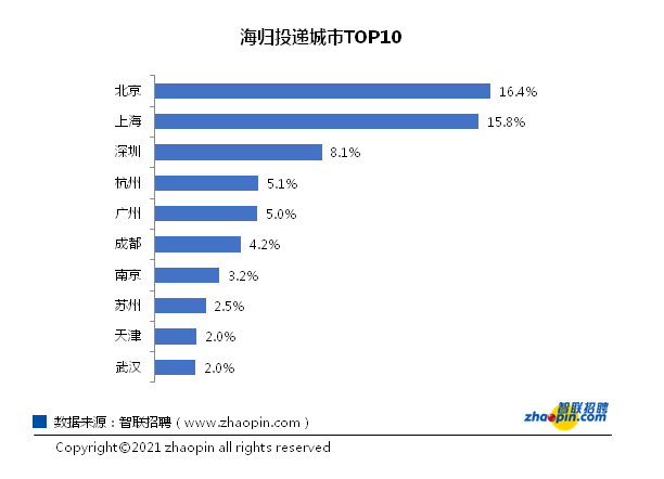 荆楚网客户端—荆楚网消息(记者徐蕾 实习生周懿思 通讯员白雪)9日,智联招聘发布《2020中国海归就业创业调查报告》(下称《报告》)显示,10座城市吸纳了64.2%的海归就业需求,其中排名前二的北京、上海吸纳人才超3成。成都、南京、苏州、天津、武汉等城市,依靠较强的发展潜力与引才政策,跻身海归人才吸引力榜单前十。
