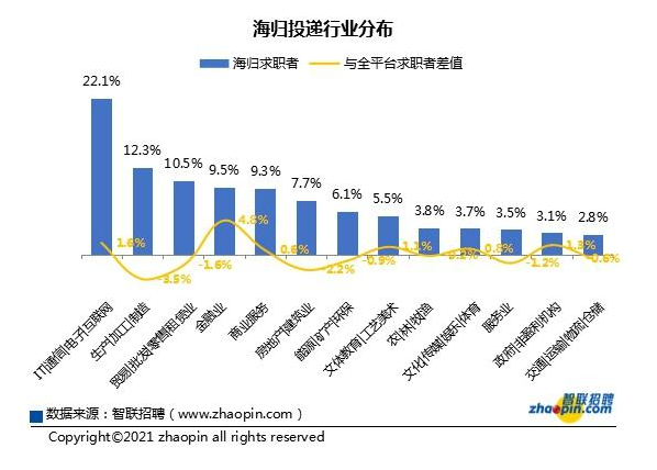 海归群体所具有的高学历特点更加凸显。作为求职海归的中坚力量,硕士在2019年占整体的70.7%,2020年扩张至72.4%;博士占比1.7%,与去年基本持平;本科群体占比25.9%,较去年收缩1.9个百分点。金融、互联网、文娱行业更受海归偏爱。其中,9.5%的海归向金融业投递简历,比全平台求职者占比高出4.8%。