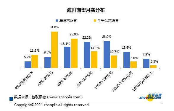 排名前十的城市吸纳了64.2%的海归就业需求,北京、上海两城则合计占超三成,深圳占8%。杭州与广州不相上下,均在5%左右。武汉等城市依靠较强的发展潜力与引才政策,也促使海归人才积极奔赴。《报告》显示,在全平台求职者中,期望薪资在4000-6000元/月内的占比最高,达31%,其次是6000-8000元/月,占比25%。而海归求职者的期望薪酬则整体向着高薪区间移动,主要分布在8000-10000元/月与10000-15000元/月,分别占22.2%、23%,还有18.1%选择6000-8000元/月。