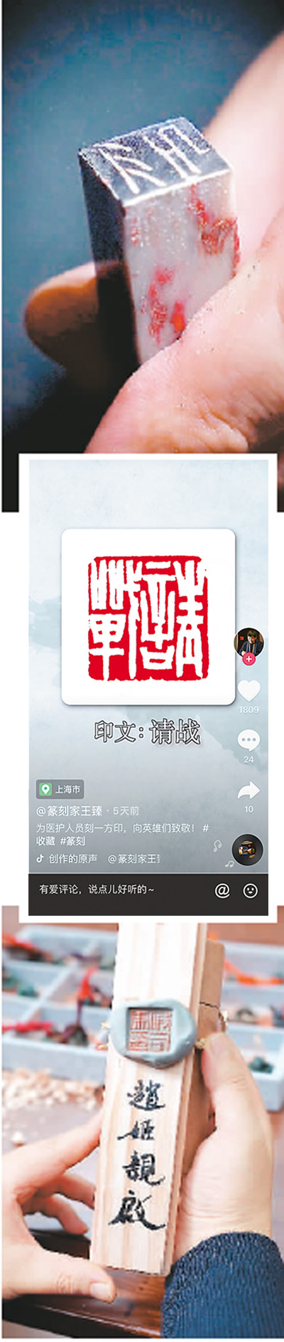 图片从上至下分别为:篆刻家王臻、王臻在篆刻印章、王臻为抗疫医护人员篆刻的印章《请战》、王臻展示古代封泥的制作。受访者及抖音供图