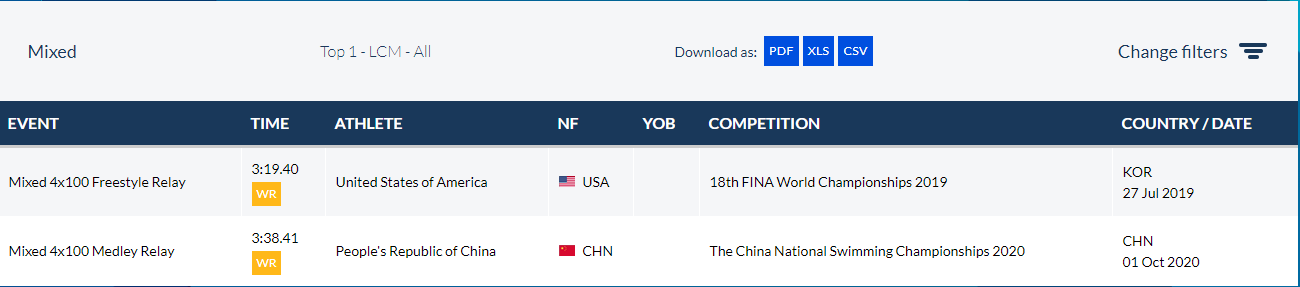 2020年10月1日,在青岛举行的2020全国游泳冠军赛暨东京奥运会达标赛男女4X100米混合泳接力预赛上,由徐嘉余、闫子贝、张雨霏、杨浚瑄组成的苏鄂浙鲁队游出了3分38秒41的成绩。这个成绩比原来由美国队保持的世界纪录提升了0.15秒。但因为是国内比赛,该成绩能否成为新的世界纪录,还需要国际泳联进一步确认。今年1月19日,国际泳联终于通过其官网确认了这个成绩,新的男女4X100米混合泳接力的世界纪录正式归于中国队名下。
