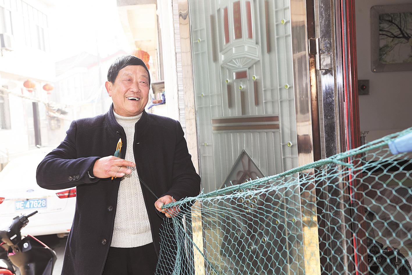 62岁的退捕渔民刘红岗在自家门口编织渔网,乐呵呵的,还没说话,就开心地笑了:“村里现在环境好得很,都是江景房,推开窗就是鸟语花香,还能看见一江清水、一片蓝天,天上的飞机、江上的轮船看得清清楚楚。”他说,渔网是卖给鱼塘养殖户的,不能让祖传的手艺荒废了。老刘在长江上捕鱼40多年,从2019年4月起每月领到800多元养老保险金。
