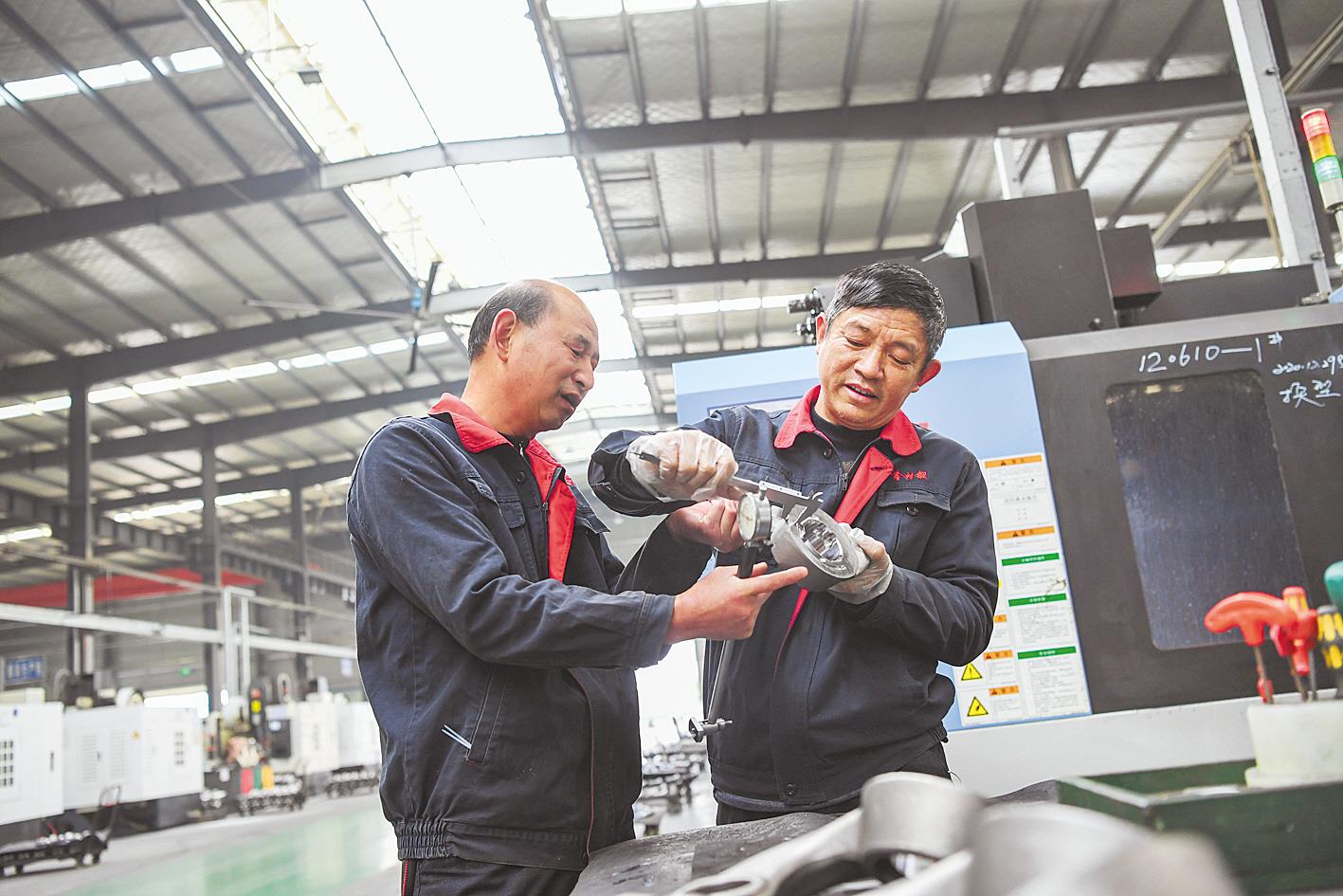 白水港村退捕渔民王长春(右)进入工厂就业后,刻苦学习技能,努力适应新岗位。