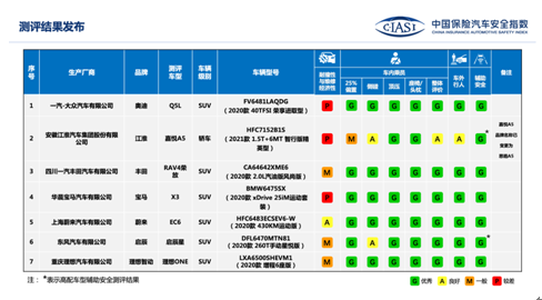在中国保险行业协会的指导下,在中国汽车工程研究院股份有限公司和中保研汽车技术研究院有限公司的鼎力支持与协调配合下,中国保险汽车安全指数(以下简称“C-IASI”)的系统研究与测评规则对国内汽车安全质量升级换代和车险车型风险精准研究评价正发挥着越来越重要的作用。1月21日,中保研汽车技术研究试验中心(北京)有限公司在严格按照有关规定切实落实好疫情防控要求的前提下,在北京召开测评结果发布会,发布了C-IASI七款车型测评结果,涉及车型包含一汽-大众奥迪Q5L、江淮嘉悦A5、一汽丰田RAV4荣放、华晨宝马X3、蔚来EC6、东风启辰启辰星以及理想ONE。测评工作按照《中国保险汽车安全指数规程(C-IASI 2017版)》实施。对于此次测评结果审查与发布工作,中国保险行业协会和中国保险汽车安全指数工作领导小组高度重视,邀请了高校、汽车、保险等行业的汽车安全技术与标准领域的著名教授、专家,对此次发布的车型测评结果进行了评审,确保评价结果专业、客观、公平、公正。