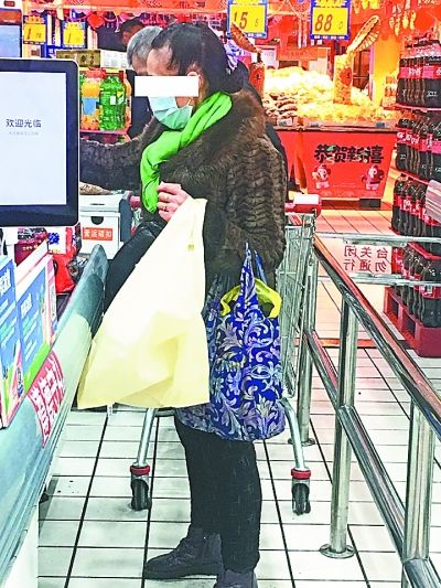 收银台前拎着两个环保袋的市民。