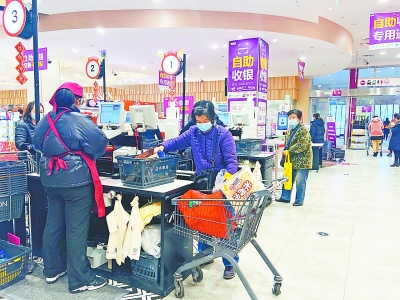 永旺金桥店收银处,市民使用自备购物袋装采购商品。记者赵歆 摄