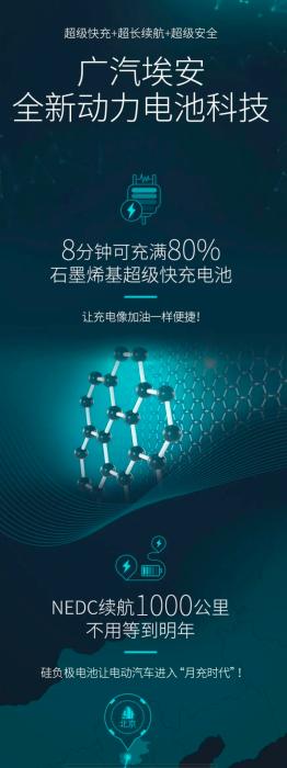 电动汽车的里程焦虑一直是消费者的大痛点。因此,当广汽埃安近日发布的一则全新动力电池科技海报随即在业内引起了热议。海报显示,其搭载石墨烯基超级快充电池的车型8分钟可充满80%,NEDC续航里程1000公里。