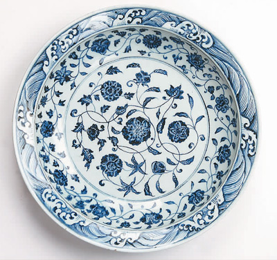 明青花缠枝莲纹折沿盘。中国航海博物馆供图 |