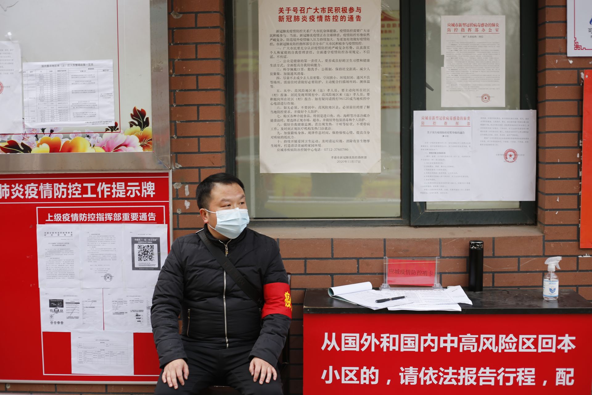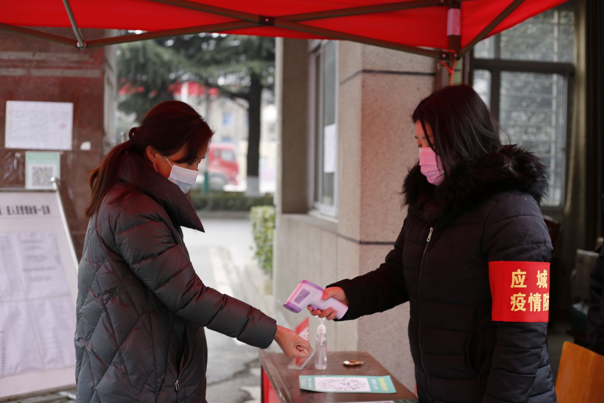 应城市税务局门口,疫情防控工作人员值守在防控哨卡,来访人员一一进行扫码、登记和测温,并介绍当前防控政策。该单位有7处家属院,常住人口394人,院内防控以老干支部为载体,选择有威望的老干部对院区居民进行网格化管理,并建立了家属院防控群,及时宣传当前防控政策。
