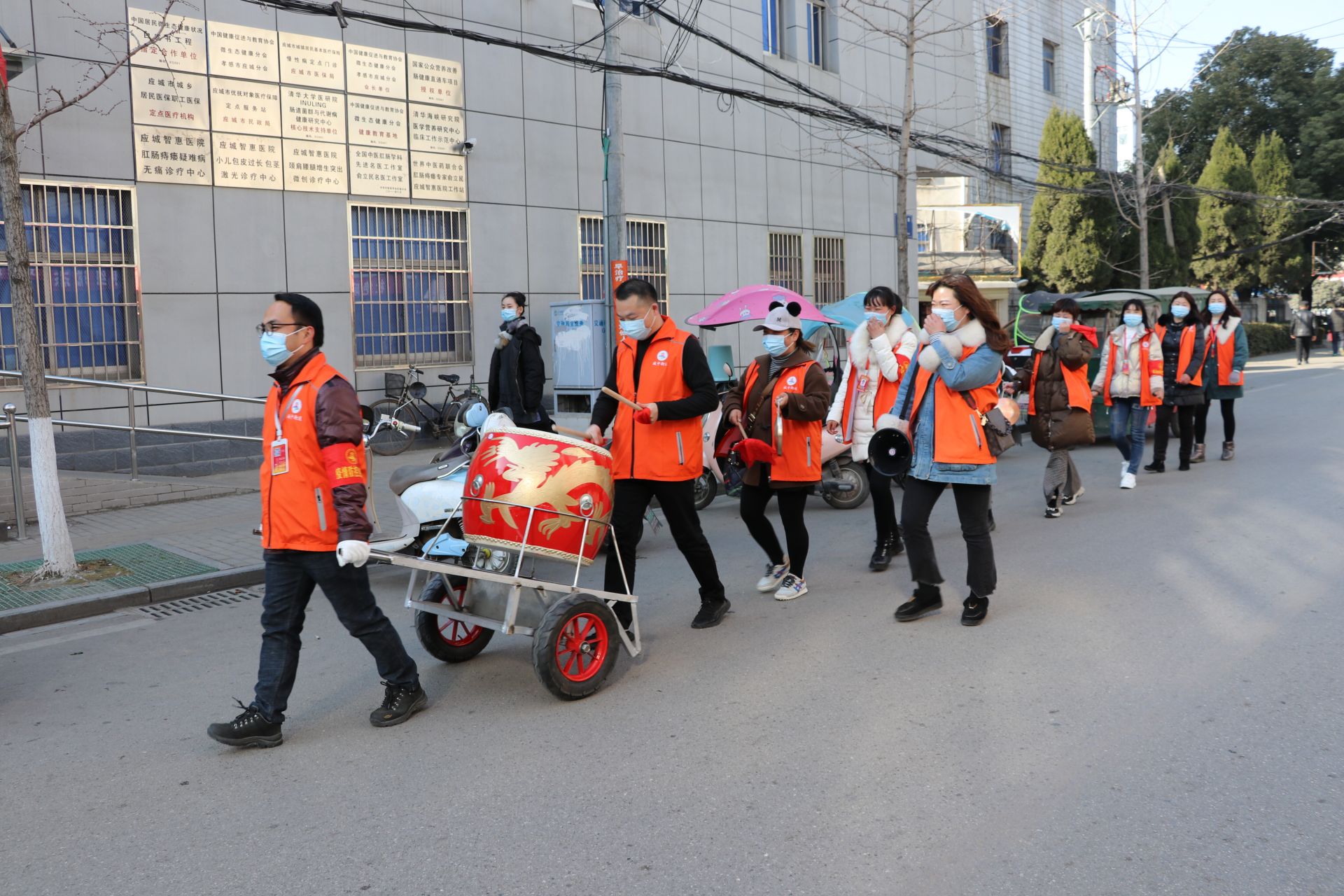 疫情防控工作人员敲锣打鼓宣传疫情防控知识。通讯员供图