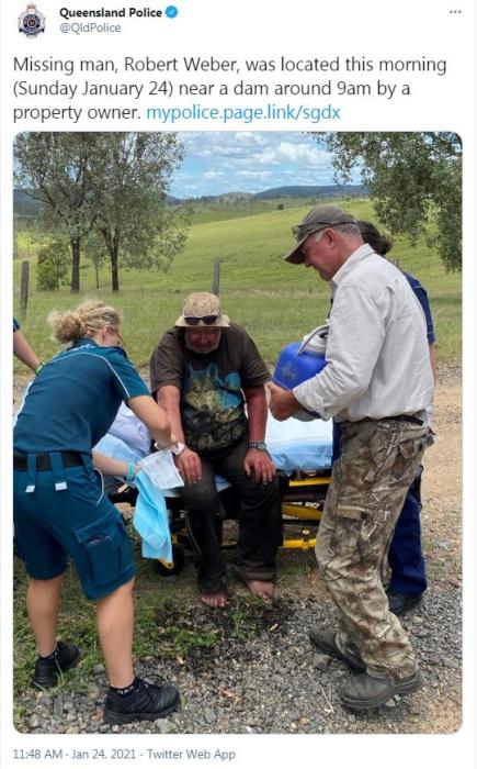 昆士兰警方指出,韦柏身体状况目前无大碍,已送医休养,但尚未寻获其爱犬。