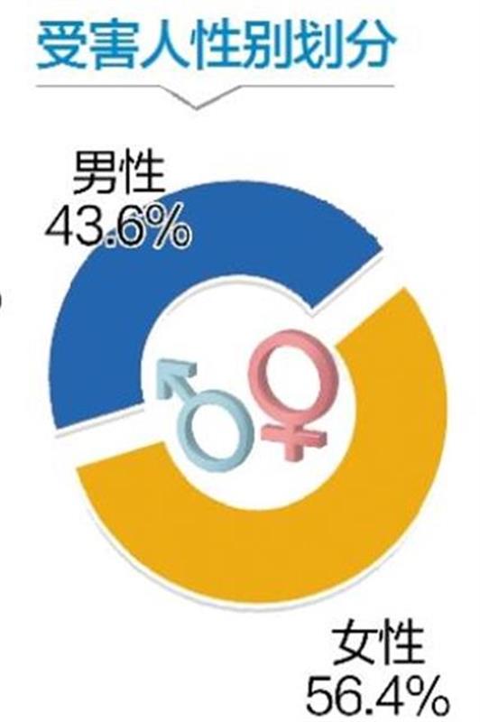 ○ 受害人性别划分:女性占56.4%、男性占43.6%。