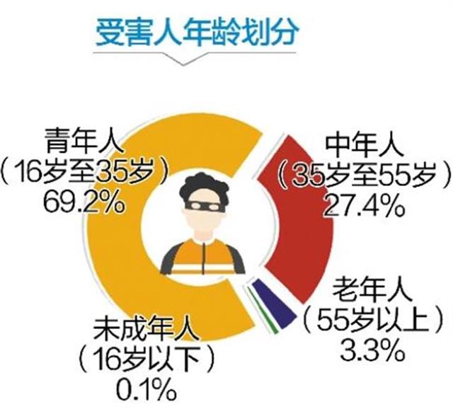 ○ 受害人年龄划分:青年人(16岁至35岁)占69.2%、中年人(35岁至55岁)占27.4%、老年人(55岁以上)占3.3%、未成年人(16岁以下)占0.01%。