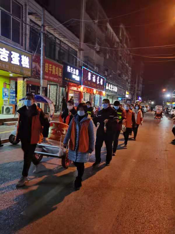 1月20日傍晚,农历腊月初八,应城市城中街道办事处月圆社区下沉党员敲响锣鼓,一边开展治安巡逻,一边就疫情防控内容进行宣传。