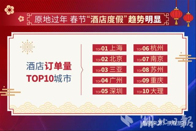 酒店方面,在“就地过年”倡议下,今年春节消费者“酒店度假”趋势明显,城市度假酒店、近郊度假酒店更受消费者青睐,全国多地一房难求。来自携程最新数据显示,上海、北京、三亚、广州、深圳、杭州、南京、苏州、重庆、大理为酒店订单量前十城市。上海、北京、深圳、苏州、大理位列酒店订单增幅前五。