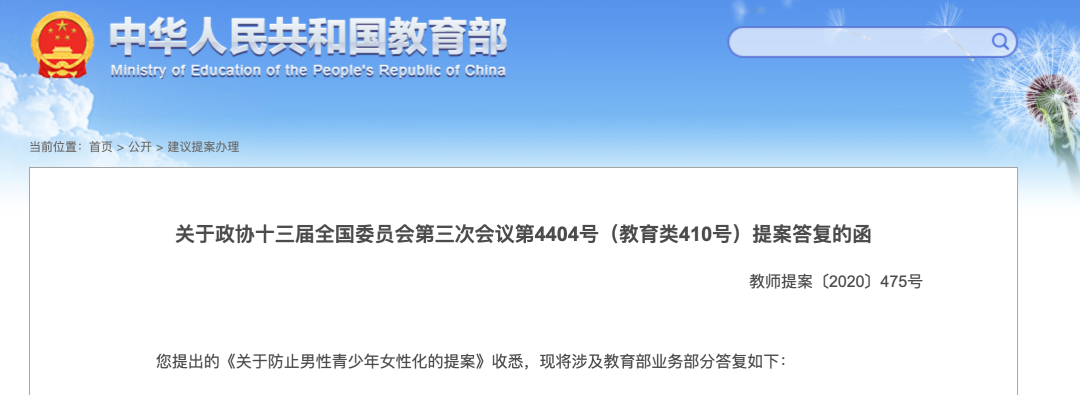 针对有全国政协委员提出《关于防止男性青少年女性化的提案》,1月28日,教育部官网发布的《关于政协十三届全国委员会第三次会议第4404号(教育类410号)提案答复的函》表示,将从加强体育教师配备、加强学校体育制度顶层设计、深入开展健康教育及加强青少年心理健康教育相关问题研究等方面更好的解决这一问题。
