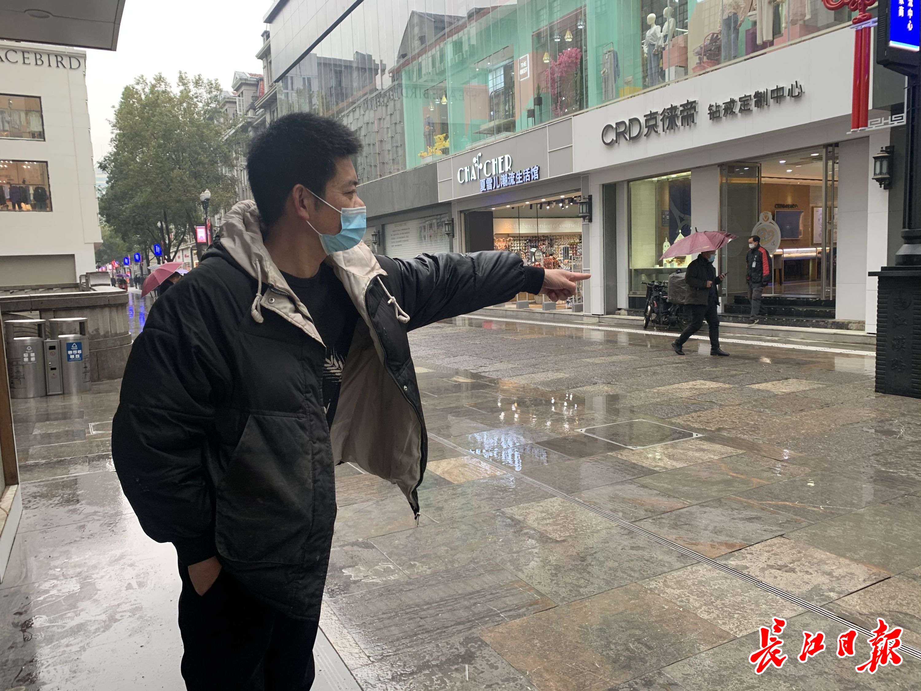 谢丙龙告诉记者,当日姑娘晕倒的地点就在江汉路步行街靠近鄱阳街路口的路面正中。记者夏奕 摄
