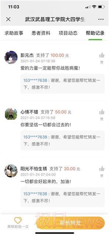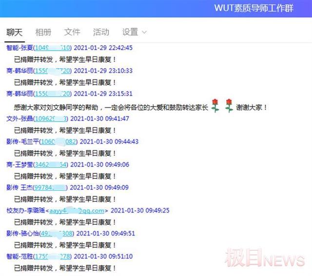 该校商学院团委书记信睿介绍,截止1月31日通过全校师生校友们的共同努力,共有2000余人参与捐款,共募集到善款5.3万余元。感受到师生们满满的爱心和温暖刘文静同学感动地说:“无论结果怎么样,我都会满怀希望的和病魔战斗下去,希望可以重新和大家在一个阳光明媚的日子相逢,感恩所有人!”