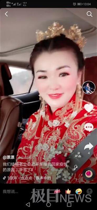 30日上午8点多钟,家住武汉东湖高新区豹澥街庙岭村的新娘鲍未菊,等到了前来接她的新郎周海平。“我们结婚了,老公自己开车接我回家。”在去新郎家的路上,坐在车副驾驶座位的鲍未菊,拍摄了一段视频,分享在自己的抖音上,吸引了数万网友点赞。鲍未菊告诉记者,原本父母和家人准备送亲,考虑到疫情防控要求和父亲重病在身的情况,最终她决定独自一人出嫁。