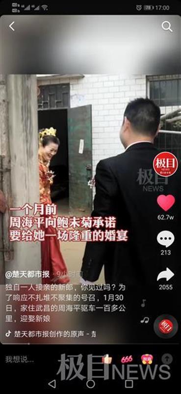 极目新闻1月31日讯(记者周治涛 视频剪辑贾淑瑞 通讯员陈建红)31日,响应春节人员不聚集号召,武汉新洲区徐古街新郎周海平,独自驱车百余公里去新娘家迎亲的故事,经过楚天都市报极目新闻及官方抖音号、微信公众号等平台报道,引发上千万网友和读者关注,大家纷纷为新人家庭响应防疫号召的举动点赞,并为一对新人真挚温暖的爱情送上祝福。