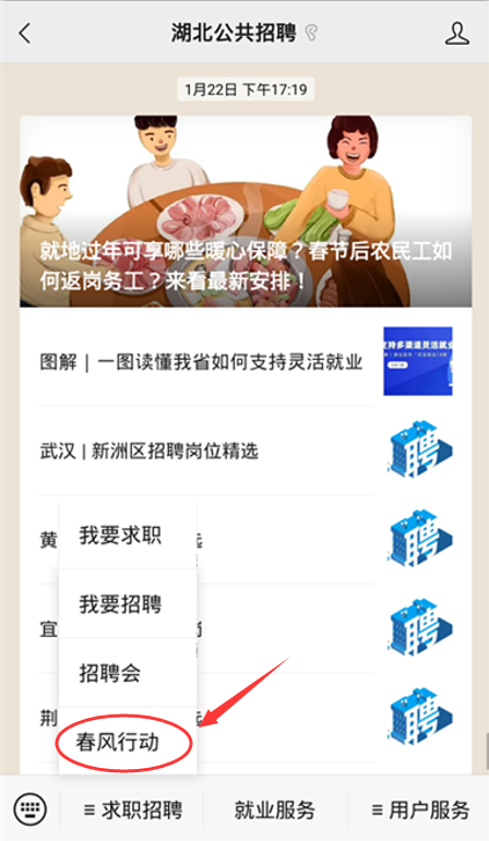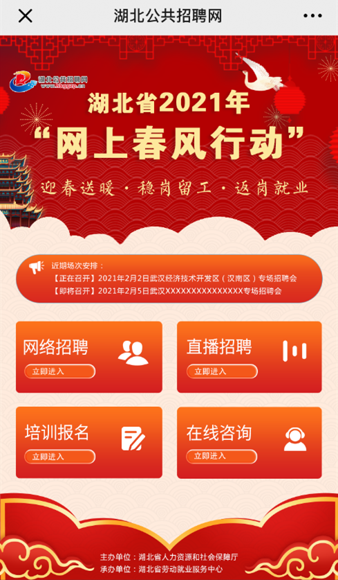 今年“网上春风行动”在湖北公共招聘网和“湖北公共招聘”微信公众号开设统一入口,并设置“直播招聘”、“网络招聘”、“培训报名”、“在线咨询”等专区。同时建立“6+1”劳务协作和宁波申洲集团招聘专区,常态化发布外省招聘信息。