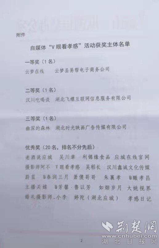 荆楚网客户端—荆楚网消息(通讯员程国辉)1月26日,孝感市互联网信息办公室通报了关于自媒体“V眼看孝感”活动评选结果,应城市“老酒说应城”、“吴川章”、“应城在线网”、“主播关嫦”、“婷陀(湖北应城)”5个活动主体发布的作品获评优秀奖。
